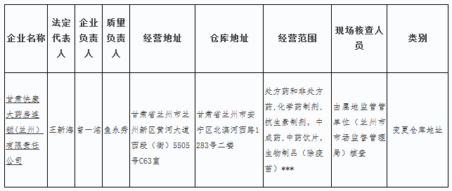蘭州新區(qū)開辦、變更、換發(fā)、注銷藥品經(jīng)營(零售、零售連鎖)企業(yè)公示公告2020第08號