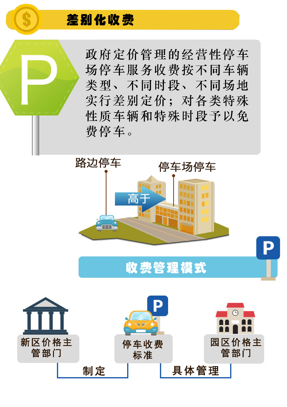 五是收費(fèi)管理模式。新區(qū)價(jià)格主管部門(mén)制定新區(qū)停車(chē)收費(fèi)標(biāo)準(zhǔn),各園區(qū)價(jià)格主管部門(mén)負(fù)責(zé)具體管理,包括登記、確認(rèn)機(jī)動(dòng)車(chē)停放服務(wù)收費(fèi)定價(jià)方式和收費(fèi)標(biāo)準(zhǔn)。
