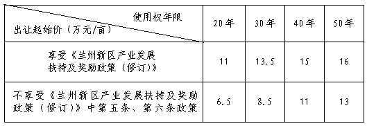 第七條  入駐產(chǎn)業(yè)園的企業(yè)可自主選擇是否享受《蘭州新區(qū)產(chǎn)業(yè)發(fā)展扶持及獎勵政策(修訂)》中第五條、第六條關(guān)于投資獎勵的優(yōu)惠政策,選擇不同供地價格,按下表執(zhí)行。