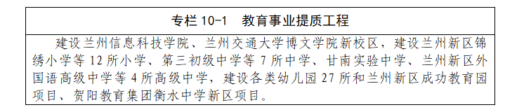 ——民生社會事業(yè)全面進(jìn)步。統(tǒng)籌推進(jìn)城鄉(xiāng)教育、衛(wèi)生、文體等公共服務(wù)可及性、均等化。建成各級各類學(xué)校53所,中小學(xué)和幼兒園總學(xué)位達(dá)4.8萬個,學(xué)前三年毛入學(xué)率達(dá)到93.8%,九年義務(wù)教育鞏固率達(dá)到100%,高等教育毛入學(xué)率達(dá)到57.58%。職教園區(qū)建成院校7所、在建6所,入駐師生7.5萬人。蘭州新區(qū)第一人民醫(yī)院投入運(yùn)行,省人民醫(yī)院新區(qū)分院、甘肅省殘疾人康復(fù)中心醫(yī)院即將投用,建成城鄉(xiāng)居民15分鐘就醫(yī)圈、應(yīng)急圈和較為完備的三級醫(yī)療網(wǎng)絡(luò)。人均體育場地增至5.5平方米,超過全省全市人均面積2倍以上。省經(jīng)濟(jì)社會展覽館、職教園區(qū)圖書館、音樂廳、省體育館、新區(qū)圖書館、檔案館等設(shè)施建成開放。新區(qū)社會福利院、救災(zāi)物資儲備庫建成投入使用。累計(jì)新增就業(yè)人口13.3萬人?;攫B(yǎng)老保險(xiǎn)制度實(shí)現(xiàn)全覆蓋,基礎(chǔ)養(yǎng)老金、低保和醫(yī)保財(cái)政補(bǔ)助標(biāo)準(zhǔn)持續(xù)提高。“法治新區(qū)”建設(shè)深入推進(jìn),掃黑除惡專項(xiàng)斗爭取得壓倒性勝利,綜治工作取得顯著成效,人民群眾幸福感、獲得感、安全感大幅提升。