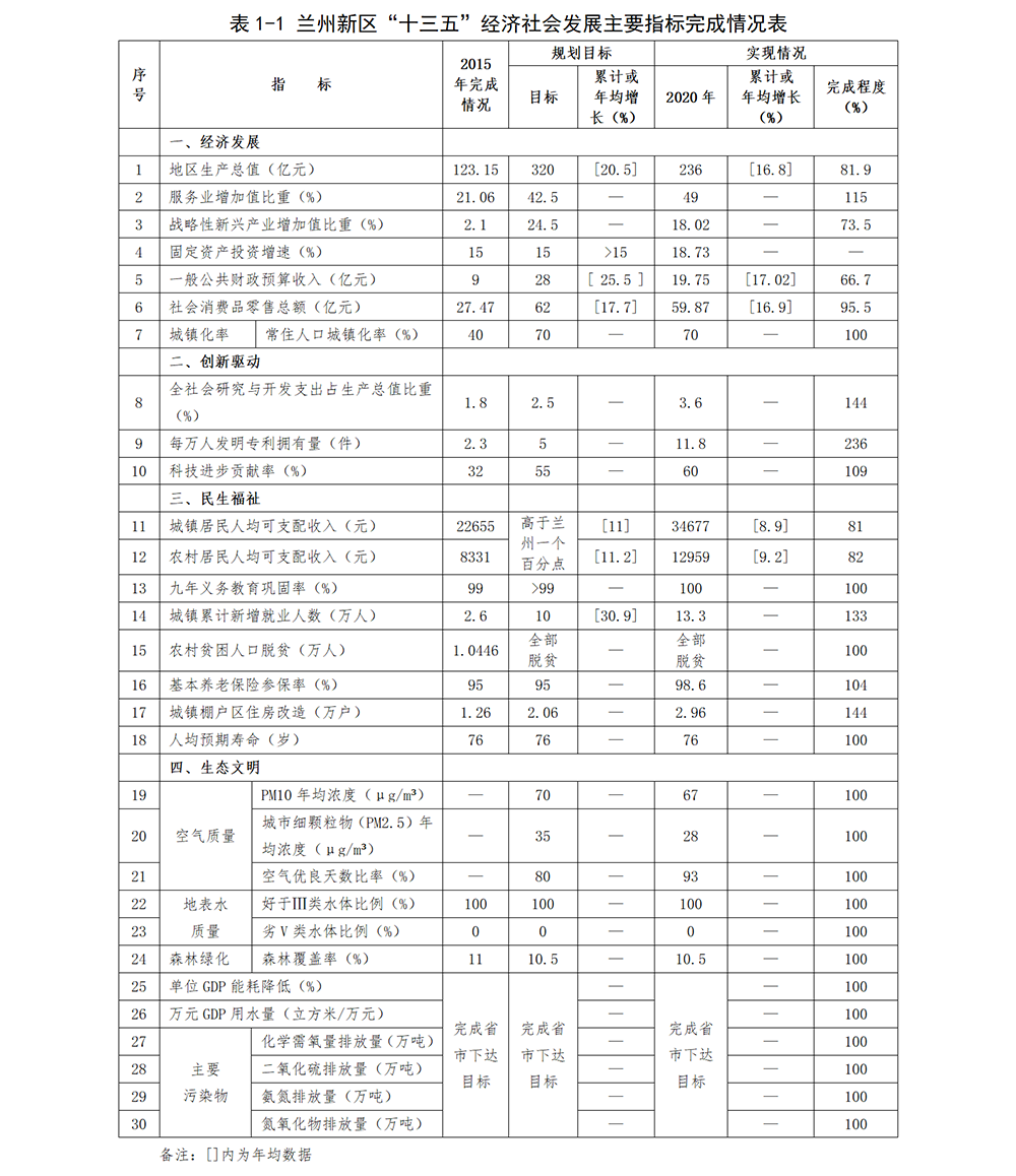 “十三五”時期,是蘭州新區(qū)經(jīng)濟(jì)社會發(fā)展取得重大成就的五年,規(guī)劃綱要提出的大部分指標(biāo)如期實(shí)現(xiàn)(詳見表1-1)。經(jīng)過五年的不懈探索和艱辛努力,實(shí)現(xiàn)了城市由拓荒起步向新城崛起的轉(zhuǎn)變,改革由學(xué)習(xí)跟跑向示范領(lǐng)跑的轉(zhuǎn)變,發(fā)展由基礎(chǔ)設(shè)施投資拉動向產(chǎn)業(yè)支撐帶動的轉(zhuǎn)變,城市管理由粗放向智慧精細(xì)轉(zhuǎn)變,呈現(xiàn)出經(jīng)濟(jì)高質(zhì)量快速發(fā)展、改革體系基本建立、現(xiàn)代產(chǎn)業(yè)體系加速形成、城市功能日益完備、對外開放水平顯著提升、民計(jì)民生有力保障、社會大局和諧穩(wěn)定的良好態(tài)勢,為“十四五”開啟全面建設(shè)社會主義現(xiàn)代化國家新征程奠定了堅(jiān)實(shí)基礎(chǔ),蘭州新區(qū)發(fā)展已站在了新的歷史起點(diǎn)上,正處于破繭蝶變、加速騰飛的關(guān)鍵階段。五年來,蘭州新區(qū)各項(xiàng)事業(yè)能夠不斷邁上新臺階、取得新突破,得益于習(xí)近平新時代中國特色社會主義思想的科學(xué)指引,承載著省市黨委政府的堅(jiān)強(qiáng)領(lǐng)導(dǎo),書寫著新區(qū)人民的創(chuàng)新創(chuàng)造,凝結(jié)著社會各界的共同努力。
