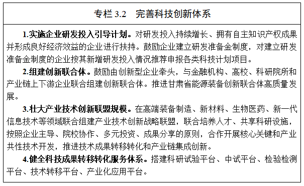 2.培養(yǎng)高成長性創(chuàng)新型企業(yè)。實施創(chuàng)新型企業(yè)領(lǐng)軍計劃、高新技術(shù)企業(yè)倍增計劃,大力培育科技型中小企業(yè)、高新技術(shù)企業(yè)、專精特新“小巨人”企業(yè)、創(chuàng)新型企業(yè)和“瞪羚”企業(yè),構(gòu)建形成從雛鷹企業(yè)到高成長型企業(yè)的梯度培育體系。發(fā)揮企業(yè)和市場在技術(shù)創(chuàng)新決策、研發(fā)投入、科研組織實施、成果轉(zhuǎn)化評價等各環(huán)節(jié)的主體和導(dǎo)向作用,支持龍頭企業(yè)申請、承擔(dān)國家和省重大科技計劃項目,圍繞主導(dǎo)產(chǎn)業(yè)發(fā)展部署科技創(chuàng)新活動和科研項目,鼓勵企業(yè)加大科技研發(fā)投入,支持產(chǎn)業(yè)共性基礎(chǔ)技術(shù)研發(fā),推動規(guī)模以上工業(yè)企業(yè)研發(fā)活動全覆蓋。健全知識產(chǎn)權(quán)激勵機制,鼓勵和支持企業(yè)加快掌握一批產(chǎn)業(yè)核心專利和技術(shù)標(biāo)準(zhǔn),積極打造一批擁有自主知識產(chǎn)權(quán)的優(yōu)勢企業(yè)。支持化工園區(qū)企業(yè)強化全產(chǎn)業(yè)鏈一體化技術(shù)攻關(guān),加大化工裝備、關(guān)鍵新材料的開發(fā)和應(yīng)用,全面提升“一體化、專業(yè)化、智能化、綠色化”水平。以正威、德福等企業(yè)為龍頭,推廣運用總成工藝技術(shù)、增材制造技術(shù)和全流程智能制造技術(shù),提高新材料產(chǎn)業(yè)技術(shù)水平。以蘭石集團、蘭州海默、蘭州電機等企業(yè)為龍頭,著力突破能源化工裝備等關(guān)鍵共性技術(shù)。以中科院近代物理所蘭州科近泰基新技術(shù)公司為重點,發(fā)展重離子治癌裝備與技術(shù)、同位素技術(shù)與產(chǎn)品。支持寶武碳業(yè)、新盛光伏、蘭石蘭駝、蘭州廣通、首航高科等企業(yè)加大動力電池、儲能電站、充電設(shè)施、廢舊電池回收利用技術(shù)研發(fā),形成具有特色的清潔能源技術(shù)創(chuàng)新鏈和產(chǎn)業(yè)鏈。