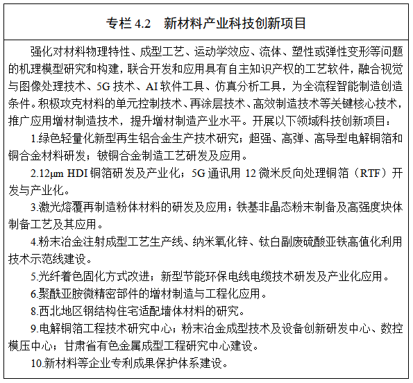 2.科技支撐新材料產(chǎn)業(yè)發(fā)展。以高鐵、新能源汽車發(fā)展需求為牽引,研發(fā)生產(chǎn)輕量化、高性能、智能型新材料制品。圍繞鋰電池、高端裝備需求,研發(fā)超強、高彈、高導(dǎo)型電解銅箔和銅合金材料。圍繞新型材料發(fā)展,研發(fā)碳纖維、粉末冶金、鈦及鈦深加工、稀土智能化生產(chǎn)技術(shù),做大做強鈦及鈦深加工產(chǎn)業(yè),培育高附加值、高技術(shù)含量稀土功能材料、新能源電池材料、新型保溫隔熱材料、生物質(zhì)建筑材料、裝飾新材料產(chǎn)品。優(yōu)化工藝技術(shù)、增材制造技術(shù)和全流程智能制造技術(shù)研究,提高新材料產(chǎn)業(yè)技術(shù)水平,打造以鋁、銅為主的西部合金材料生產(chǎn)應(yīng)用示范基地和覆蓋西北、面向“一帶一路”的先進合金材料制造中心。開展材料配方、成型工藝、生產(chǎn)流程控制研究,提高材料的質(zhì)量穩(wěn)定性。