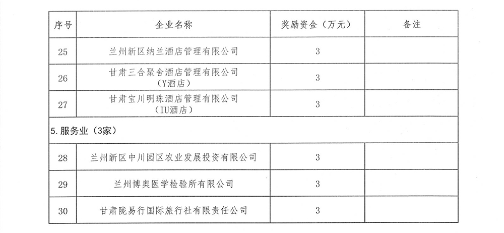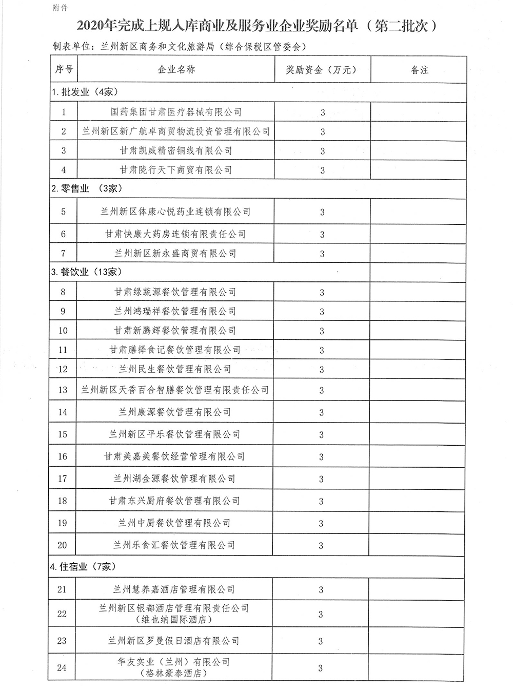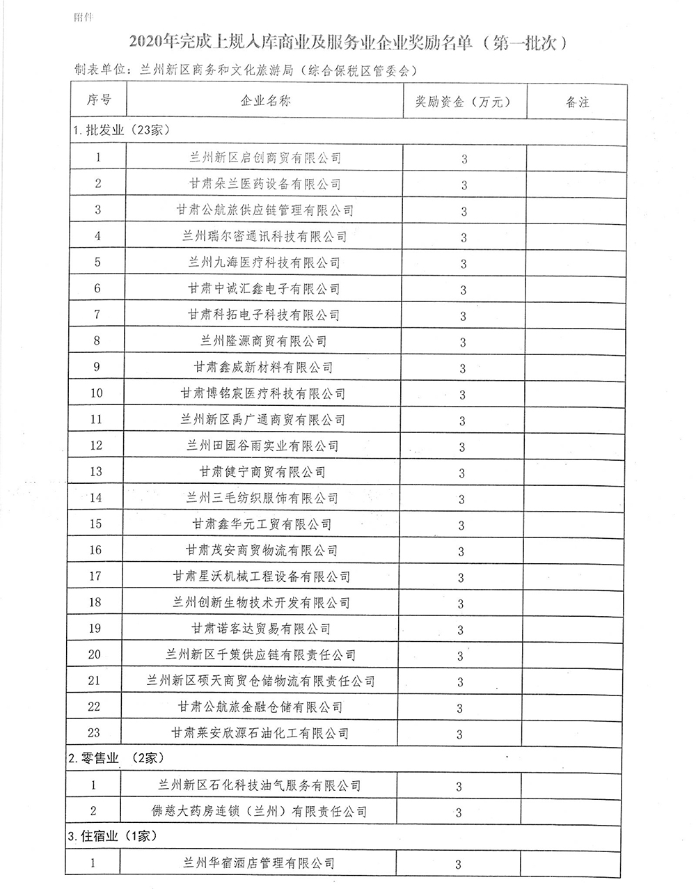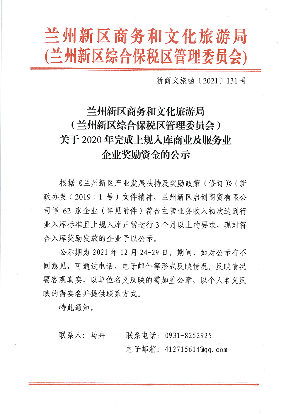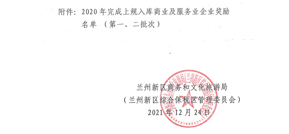 蘭州新區(qū)商務和文化旅游局(蘭州新區(qū)綜合保稅區(qū)管理委員會)關于2020年完成上規(guī)入庫商業(yè)及服務業(yè)企業(yè)獎勵資金的公示