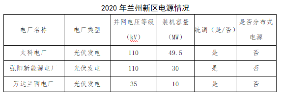 截至2020年底,蘭州新區(qū)共有3家電廠,均為新能源發(fā)電,裝機(jī)容量總計(jì)89.5MW。電源情況如下表所示: