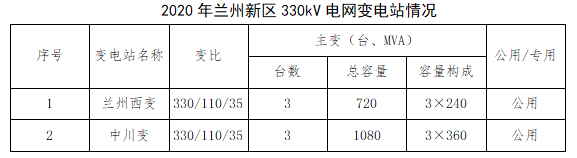 截至2020年底,蘭州新區(qū)共有330kV公用變電站2座。其中,中川主變?nèi)萘颗渲茫?×360)MW,2020年最大負(fù)荷341.2MW,最大負(fù)載率為31.59%;蘭州西主變?nèi)萘颗渲茫?×240)MW,2020年最大負(fù)荷232.5MW,最大負(fù)載率為32.29%。330kV變電站情況如下表所示: