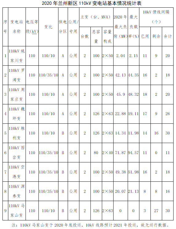 截至2020年底,蘭州新區(qū)共有110kV公用變電站9座,主變18臺(tái),容量958MW,10kV出線間隔總數(shù)189個(gè),已用124個(gè),剩余75個(gè),10kV間隔利用率60.3%。110kV變電站情況如下表所示: