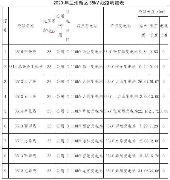 截至2020年底,蘭州新區(qū)共有35kV公用線路9條,線路全長140.41km,其中架空線路長度139.97km,電纜線路長度0.44km。35kV線路情況如下表所示: