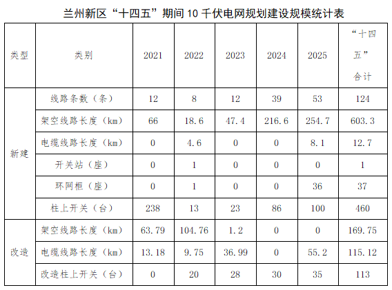 3.10千伏電網(wǎng)規(guī)劃建設(shè)。“十四五”期間,蘭州新區(qū)10千伏電網(wǎng)共規(guī)劃新建線路124條,新建架空線路603.3公里,新建電纜線路12.7公里,新建開關(guān)站1座,新建環(huán)網(wǎng)柜37座,新建柱上開關(guān)460臺(tái),改造架空線路169.75公里,改造電纜線路115.12公里,改造柱上開關(guān)113臺(tái)。具體分年度建設(shè)情況如下表所示。