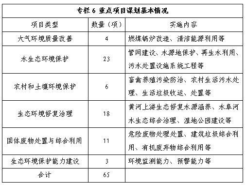 圍繞大氣環(huán)境質(zhì)量改善、水生態(tài)環(huán)境保護(hù)、農(nóng)村和土壤環(huán)境保護(hù)、生態(tài)環(huán)境修復(fù)治理、固體廢物處置與綜合利用、生態(tài)環(huán)境保護(hù)能力建設(shè)6個(gè)重點(diǎn)領(lǐng)域,初步謀劃重點(diǎn)項(xiàng)目65項(xiàng)。