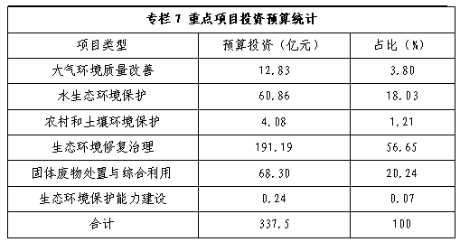 重點(diǎn)項(xiàng)目預(yù)算總投資約337.5億元,其中生態(tài)環(huán)境修復(fù)治理項(xiàng)目投資最大,占預(yù)算總投資的56.65%;水生態(tài)環(huán)境保護(hù)項(xiàng)目、固體廢物處置與綜合利用項(xiàng)目投資量大體相當(dāng),分別占18.03%和20.24%;大氣環(huán)境質(zhì)量改善項(xiàng)目、農(nóng)村和土壤環(huán)境保護(hù)項(xiàng)目、生態(tài)環(huán)境保護(hù)能力建設(shè)項(xiàng)目投資較小,分別占3.8%、1.21%和0.07%。