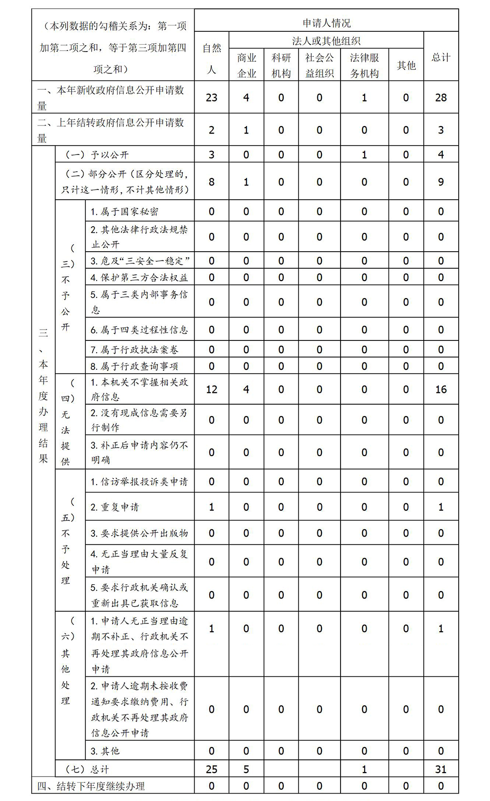 (四)規(guī)范辦理依申請公開事項。暢通受理渠道,規(guī)范答復(fù)意見,進(jìn)一步規(guī)范依申請公開事項的受理、辦理和回復(fù)程序,提升依申請公開辦理質(zhì)量。對收到的政府信息公開申請實行臺賬式管理,確保按照法定時限和程序做出答復(fù)。2021年度共處理政府信息公開申請31件,其中上年結(jié)轉(zhuǎn)3件,本年新收28件。處理結(jié)果為予以公開4件,部分公開9件,本機(jī)關(guān)不掌握相關(guān)信息16件,重復(fù)申請1件,申請人無正當(dāng)理由逾期不補(bǔ)正、行政機(jī)關(guān)不再處理其政府信息公開申請1件。行政復(fù)議結(jié)果糾正后處理2件,行政訴訟結(jié)果糾正后處理1件。