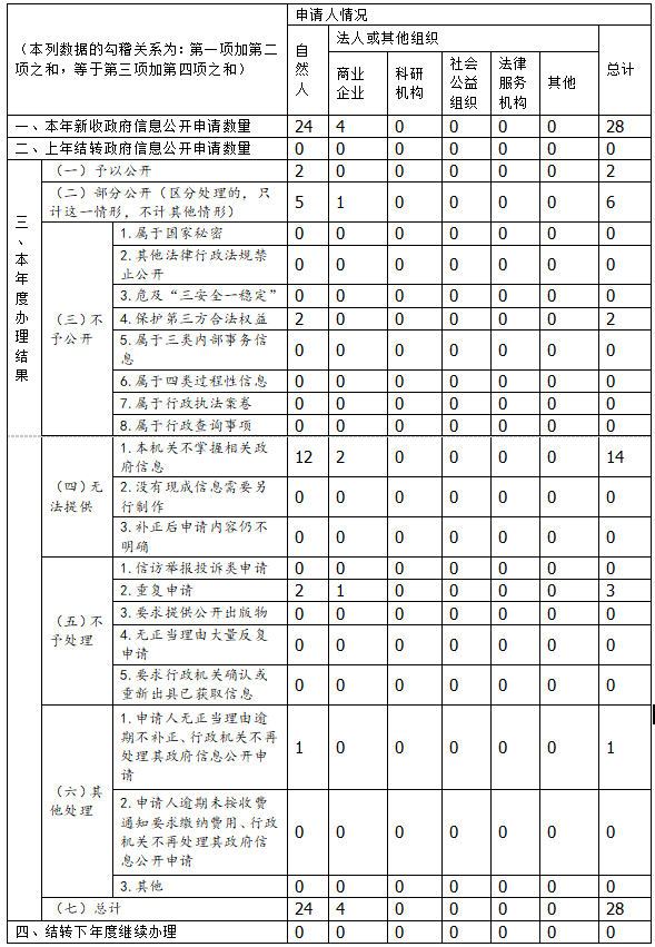 (三)暢通受理渠道,做好依申請(qǐng)公開(kāi)事項(xiàng)。進(jìn)一步規(guī)范依申請(qǐng)公開(kāi)事項(xiàng)的受理、辦理和回復(fù)程序,規(guī)范答復(fù)意見(jiàn),提升依申請(qǐng)公開(kāi)辦理質(zhì)量。對(duì)收到的政府信息公開(kāi)申請(qǐng)實(shí)行臺(tái)賬式管理,確保按照法定時(shí)限和程序做出答復(fù)。2022年度共處理政府信息公開(kāi)申請(qǐng)28件,均為本年新收件。處理結(jié)果為予以公開(kāi)2件,部分公開(kāi)6件,本機(jī)關(guān)不掌握相關(guān)信息14件,重復(fù)申請(qǐng)3件,保護(hù)第三方合法權(quán)益2件,申請(qǐng)人無(wú)正當(dāng)理由逾期不補(bǔ)正、行政機(jī)關(guān)不再處理其政府信息公開(kāi)申請(qǐng)1件。行政復(fù)議5件,結(jié)果維持3件,其他結(jié)果2件。行政訴訟6件,結(jié)果維持1件,尚未審結(jié)5件。