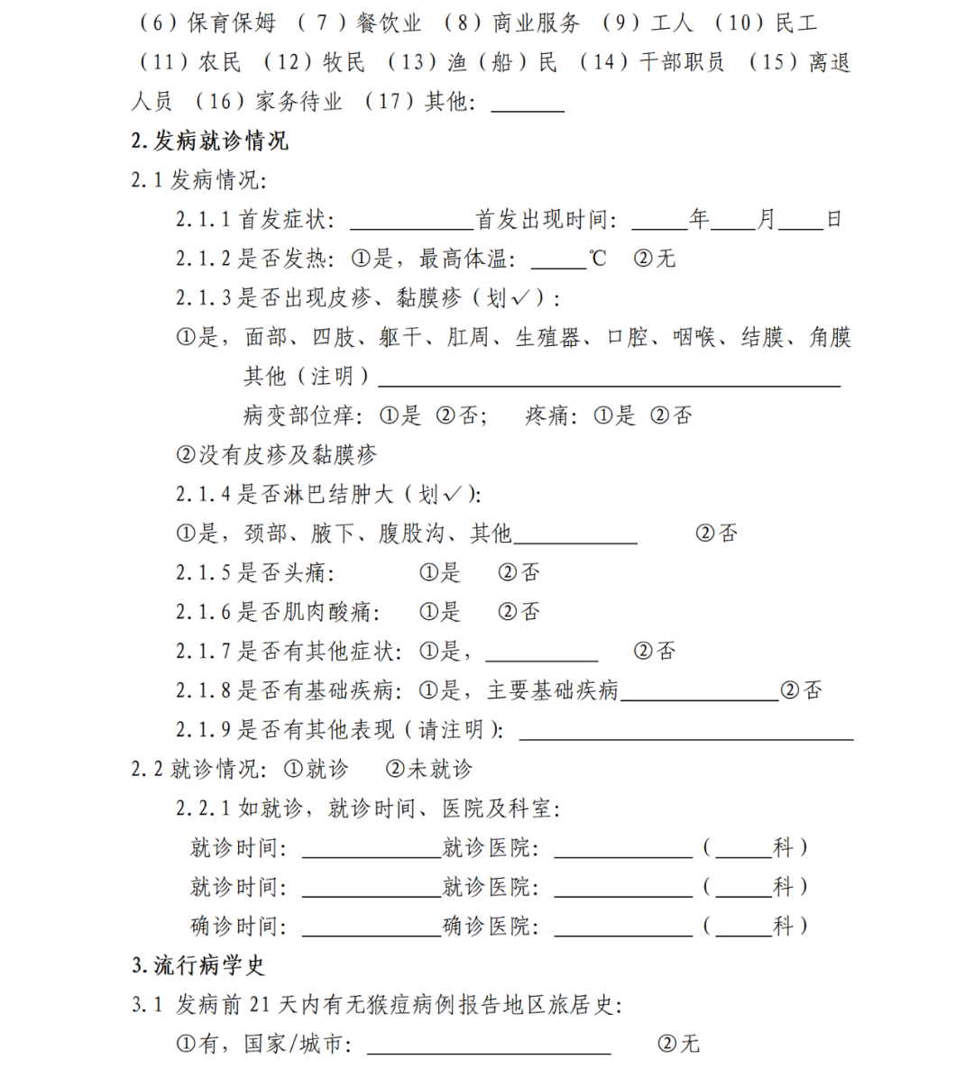 2.疑似病例。猴痘樣癥狀者,發(fā)病前21天內具備以下流行病學史中的任何一項:(1)有猴痘病例報告地區(qū)旅居史;(2)有猴痘確診病例或疑似病例接觸史;(3)有同性性行為,或性伴有同性性行為史;(4)有地方性流行區(qū)可疑動物接觸史。