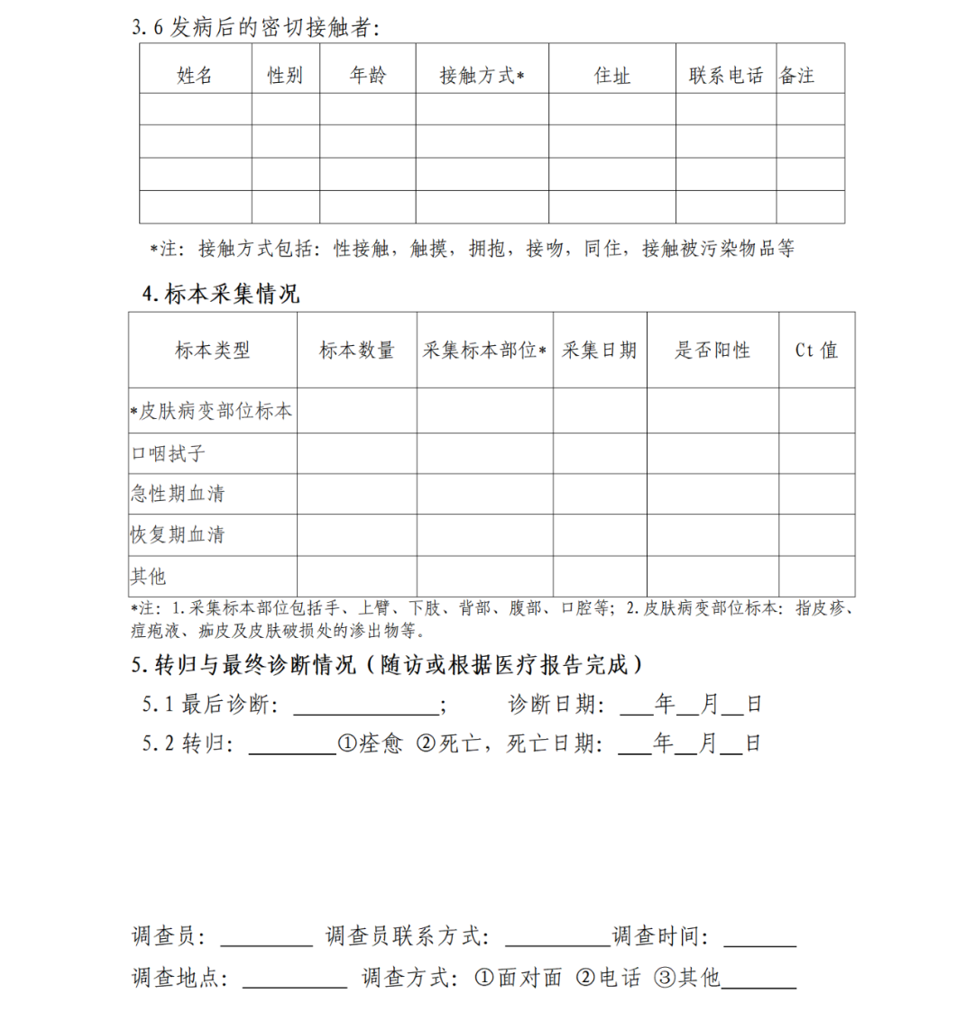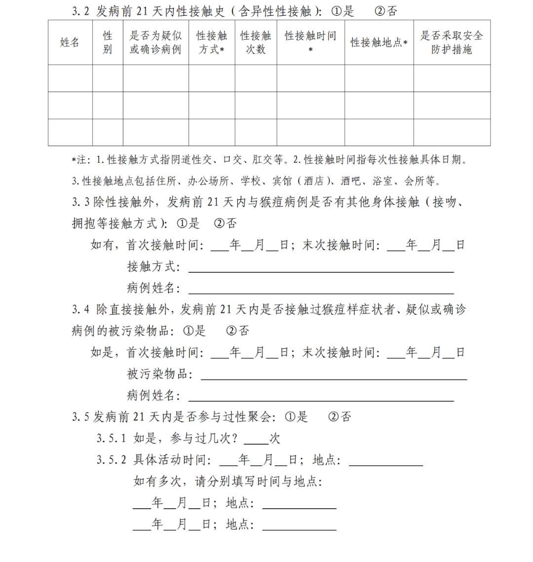 調查內容主要包括病例基本信息、發(fā)病就診情況、臨床表現(xiàn)、轉歸及實驗室檢測;發(fā)病前21天內與可疑感染來源的接觸史、接觸場所及接觸方式;發(fā)病后至隔離治療前的具體活動地點、與其有皮膚或黏膜直接接觸者,以及發(fā)病前4天內與其有性接觸者。