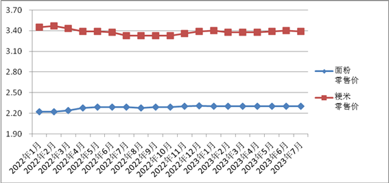 7月份,小麥、玉米平均收購價每500克分別為1.43元、1.39元,環(huán)比,小麥下降1.38%,玉米持平;與去年同期相比,小麥下降4.67%,玉米下降0.71%。面粉、粳米、菜籽油平均零售價分別為2.30元/500克、3.39元/500克、81.12元/桶,環(huán)比,面粉持平,粳米、菜籽油分別下降0.29%、0.16%;與去年同期相比,面粉、粳米、菜籽油分別上漲0.44%、1.80%、3.09%。