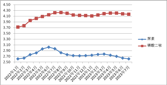 7月份,尿素、磷酸二銨、棚膜、地膜平均銷售價格分別為2.61元/公斤、4.17元/公斤、13.96元/公斤、10.97元/公斤,環(huán)比,尿素、磷酸二銨、棚膜分別下降1.14%、0.24%、0.50%,地膜持平;與去年同期相比,尿素、磷酸二銨、棚膜、地膜分別下降12.12%、1.18%、3.72%、4.53%。