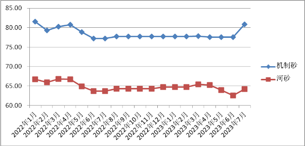 7月份,我省砂石平均出廠價格機(jī)制砂(細(xì)砂)每噸80.89元,河砂(細(xì)砂)每噸64.18元,環(huán)比分別上漲4.29%、2.61%;同比,機(jī)制砂上漲4.75%,河砂上漲0.85%。
