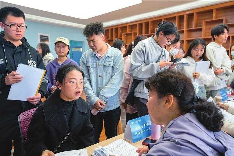 雙選會現(xiàn)場,學(xué)生在和招聘單位工作人員溝通交流。蘭州新區(qū)報記者羅晉業(yè) 攝