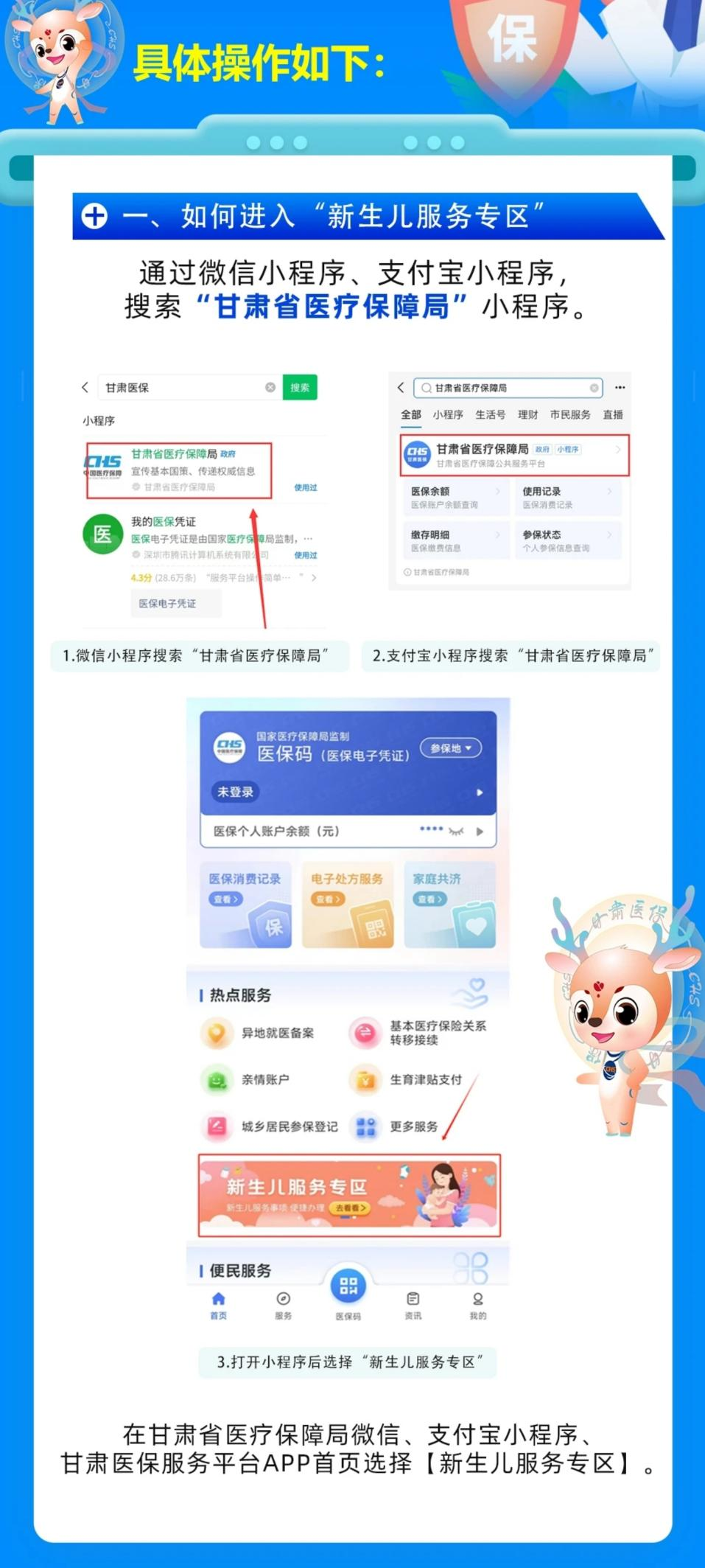 “新生兒服務(wù)專區(qū)”已接入甘肅省醫(yī)保局微信和支付寶小程序、甘肅醫(yī)保服務(wù)平臺APP。新生兒父母只需登錄以上任一平臺,進(jìn)入“新生兒服務(wù)專區(qū)”,按照提示操作即可完成相關(guān)業(yè)務(wù)辦理。