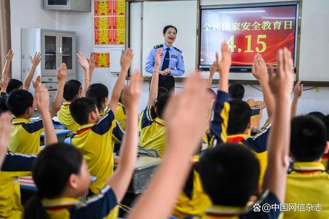 2024年4月15日,在廣西興業(yè)縣一所小學(xué)內(nèi),公安民警在講解國(guó)家安全相關(guān)知識(shí)的過(guò)程中與學(xué)生們互動(dòng)。新華社記者 曹祎銘 攝