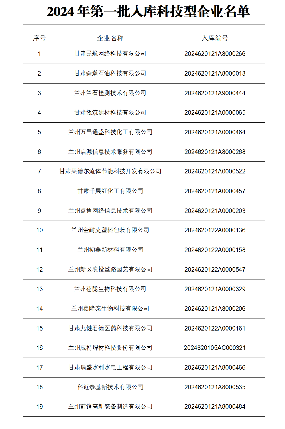 2024年7月31日,甘肅省科學技術廳公布了甘肅省2024年度第一批入庫科技型中小企業(yè)名單的通知,蘭州新區(qū)有19家企業(yè)取得“登記編號”,具體名單如下。