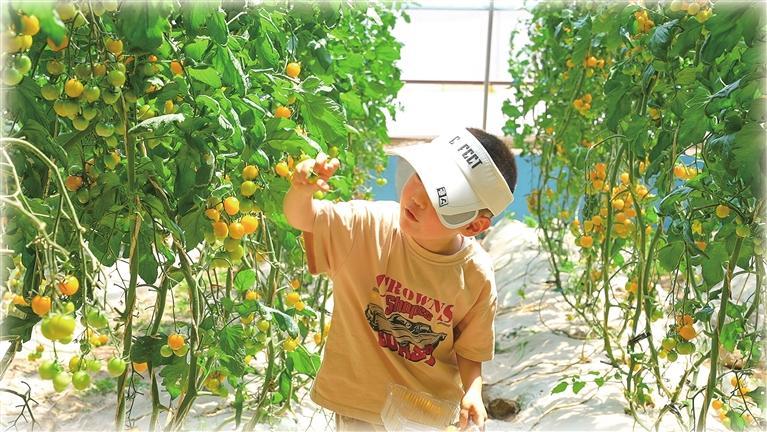 秦東生態(tài)農(nóng)場的圣女果大棚里,小朋友體驗采摘之樂。