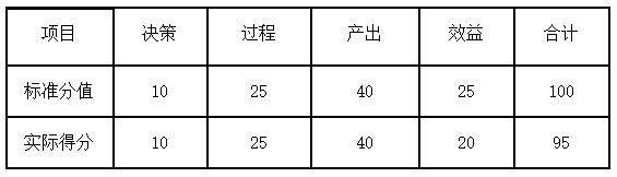 項目績效評價綜合得分為95分,評價結(jié)果等級為優(yōu)。其中過程得10分,產(chǎn)出得50分,效益得27分,滿意度得8分。一級指標(biāo)得分情況如下表:
