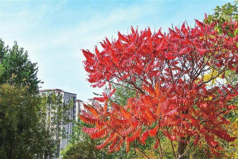 百花公園里被秋風(fēng)染紅的樹(shù)葉。