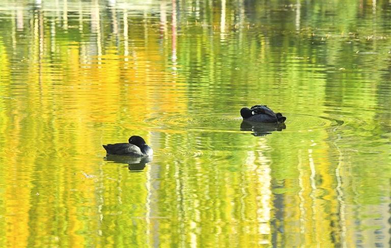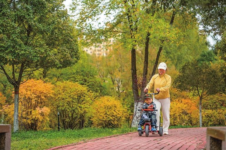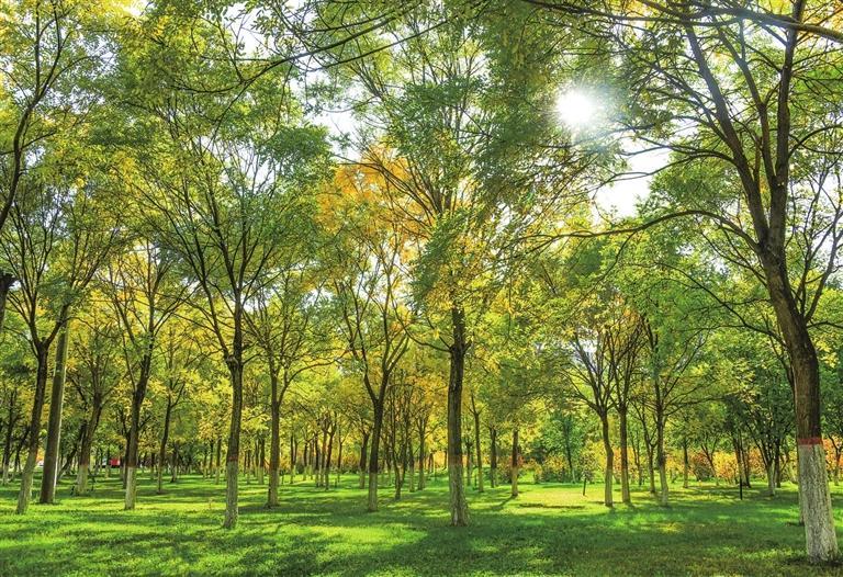 陽(yáng)光穿過(guò)百花公園的樹(shù)林,樹(shù)葉被染上了淡淡的金色。