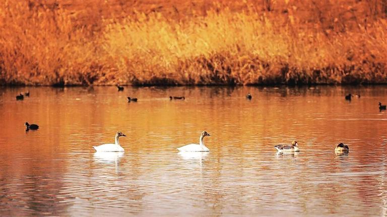 成群結(jié)隊(duì)的候鳥(niǎo)在秦王川國(guó)家濕地公園水中棲息。