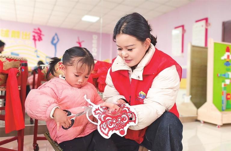 宗家梁社區(qū)工作人員和小朋友一起剪紙。