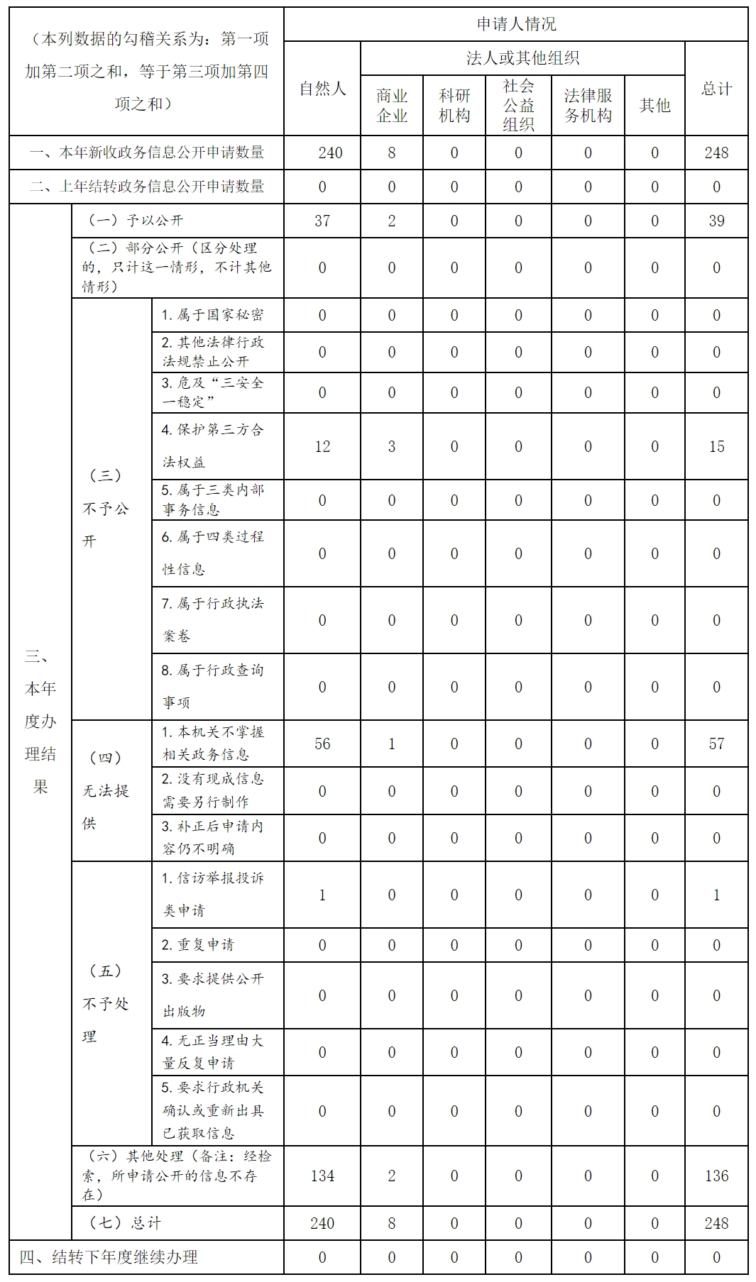 ?。ǘ┨嵘郎暾埞_規(guī)范水平。制定印發(fā)局《政府信息依申請公開工作流程》,進(jìn)一步理順和完善政府信息公開申請渠道,健全登記、審核、辦理、答復(fù)、歸檔的工作程序,規(guī)范答復(fù)行為。嚴(yán)格按照《政府信息公開條例》辦理依申請公開信息,全年共辦理政府信息公開申請248項,涉及工程建設(shè)、房產(chǎn)物業(yè)、交通運輸?shù)阮I(lǐng)域,均能夠按照流程規(guī)范辦理。同時,加強與申請人溝通,做好《政府信息公開條例》的宣傳和解釋工作,進(jìn)一步規(guī)范我局依法行政行為,提高政府信息公開質(zhì)量。