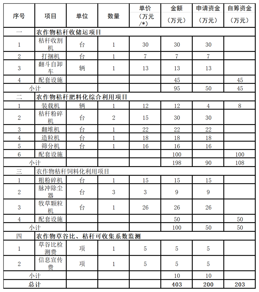 蘭州新區(qū)秦川園區(qū)2024年農(nóng)作物秸稈綜合利用試點(diǎn)項(xiàng)目計(jì)劃投資403萬元,申請(qǐng)中央財(cái)政資金200萬元,企業(yè)自籌資金203萬元。其中農(nóng)作物秸稈收儲(chǔ)運(yùn)項(xiàng)目投資95萬元,申請(qǐng)2024年中央財(cái)政補(bǔ)助資金50萬元,企業(yè)自籌資金45萬元;農(nóng)作物秸稈肥料化綜合利用項(xiàng)目投資198萬元,申請(qǐng)2024年中央財(cái)政補(bǔ)助資金90萬元,企業(yè)自籌資金108萬元;農(nóng)作物秸稈飼料化利用項(xiàng)目投資100萬元,申請(qǐng)2024年中央財(cái)政補(bǔ)助資金50萬元,企業(yè)自籌資金50萬元;農(nóng)作物草谷比、秸稈可收集系數(shù)監(jiān)測項(xiàng)目投資10萬元,申請(qǐng)2024年中央財(cái)政補(bǔ)助資金10萬元。