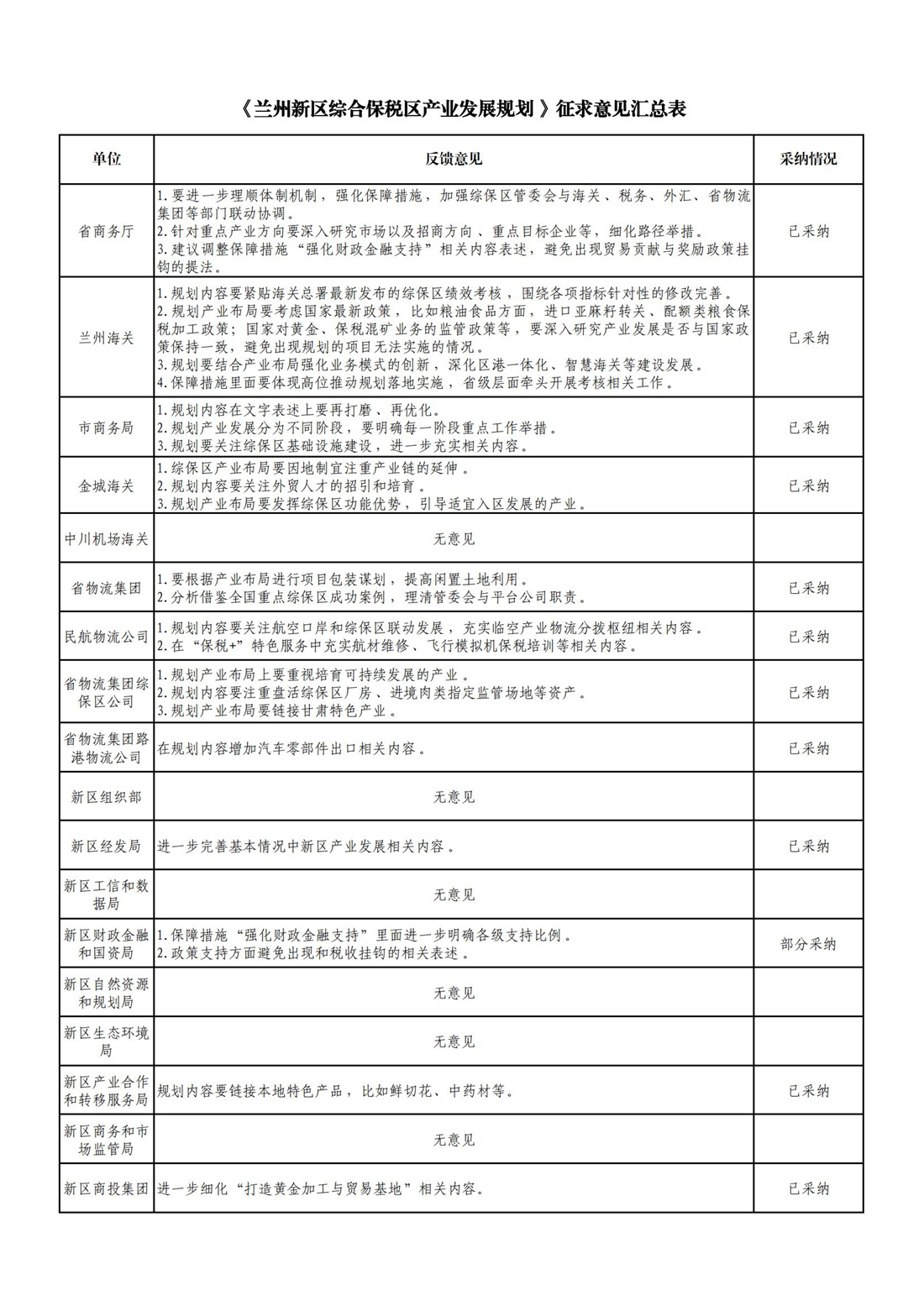 《蘭州新區(qū)綜合保稅區(qū)產(chǎn)業(yè)發(fā)展規(guī)劃 》征求意見匯總表