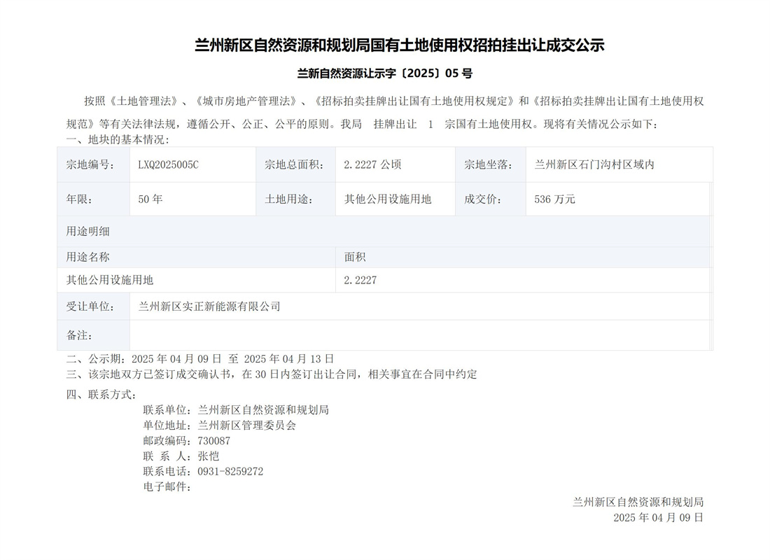 蘭州新區(qū)自然資源和規(guī)劃局國有土地使用權(quán)招拍掛出讓成交公示