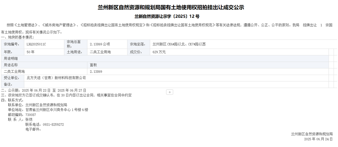 蘭州新區(qū)自然資源和規(guī)劃局國有土地使用權(quán)招拍掛出讓成交公示
