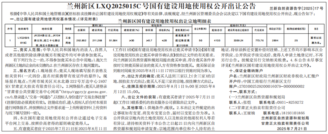 蘭州新區(qū)LXO2025015C號(hào)國(guó)有建設(shè)用地使用權(quán)公開(kāi)出讓公告