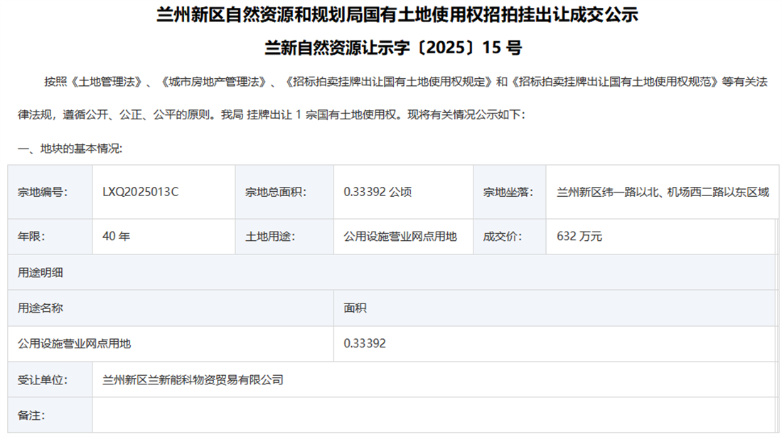 蘭州新區(qū)自然資源和規(guī)劃局國有土地使用權(quán)招拍掛出讓成交公示