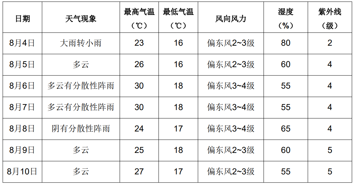 1.8月4日,新區(qū)有明顯降水天氣,請(qǐng)主辦方及時(shí)關(guān)注 天氣變化,防范強(qiáng)降水天氣對(duì)比賽的影響。