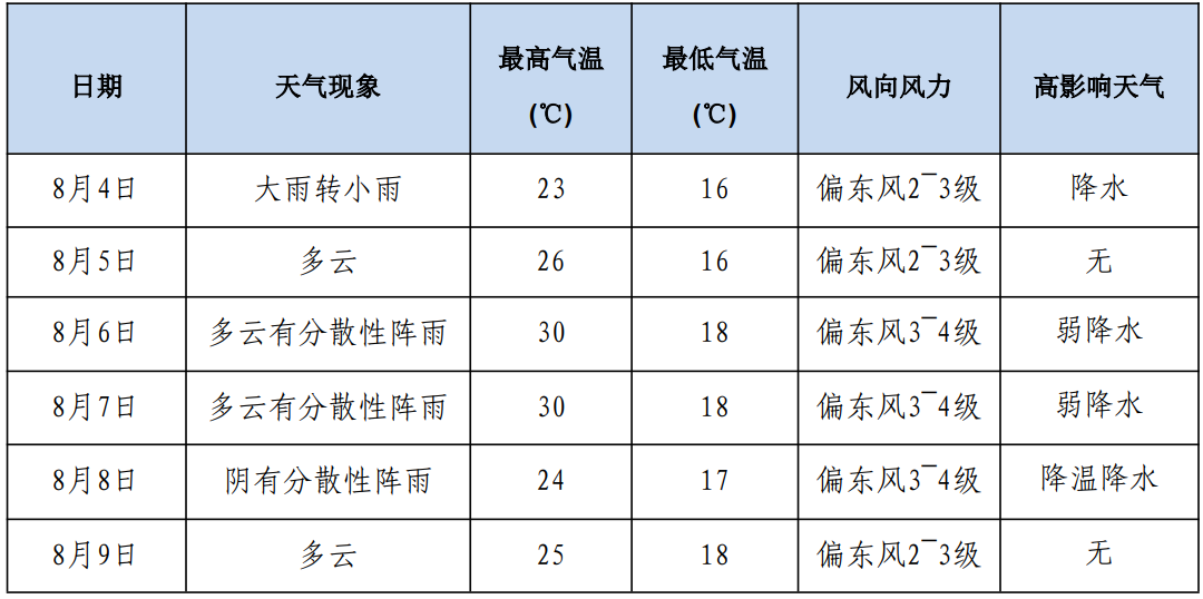 2.8月6日至8月8日,新區(qū)多分散性陣雨天氣,請(qǐng)廣大市民外 出攜帶雨具,注意道路濕滑和能見度降低對(duì)交通的影響,注意安全。