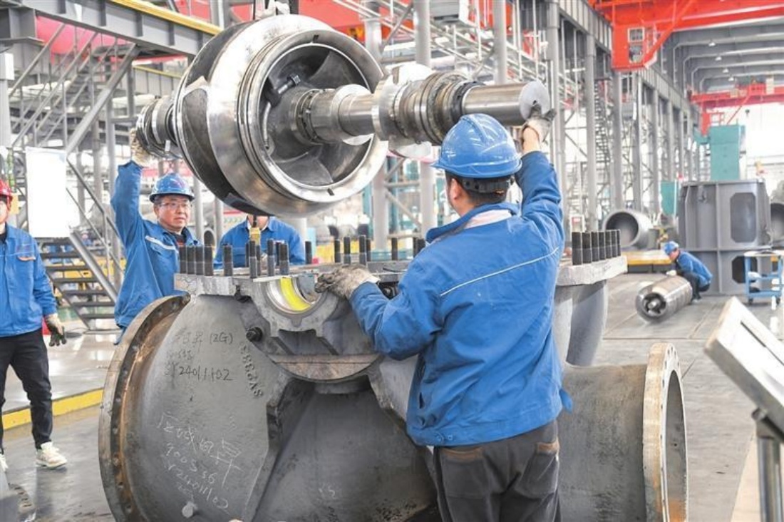 蘭泵廠生產(chǎn)車(chē)間里,兩名工人在安裝零件。