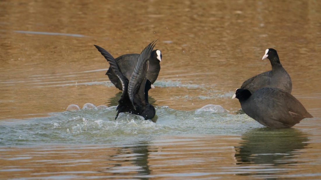 在秦王川濕地公園里嬉戲的白骨頂雞